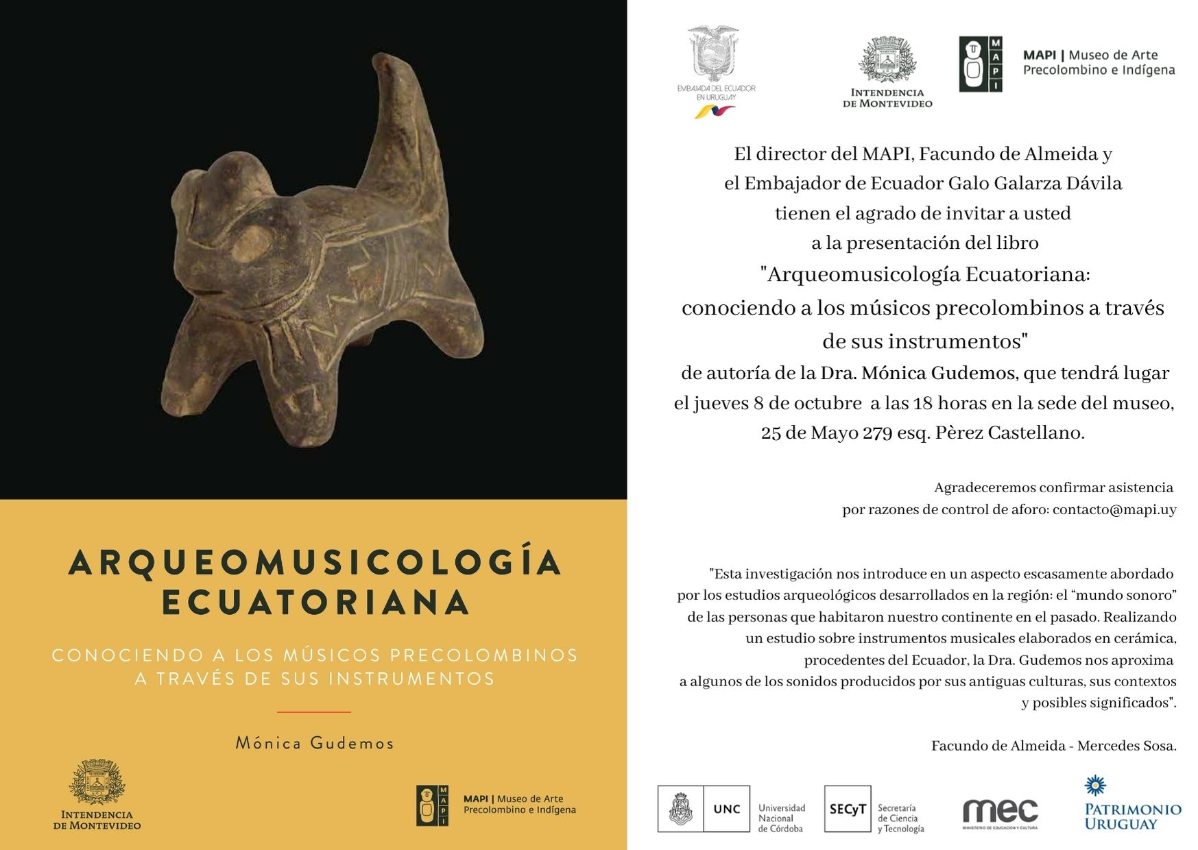 Arqueomusicología del Ecuador es el resultado de una investigación de la Dra. Mónica Gudemos (Universidad Nacional de Córdoba – Argentina) de un conjunto de instrumentos precolombinos para los que se utilizaron, por primera vez en la región, Rayos X y Tomográficas Computadas, gracias a la cooperación institucional del Hospital Maciel (ASSE) y del Centro de Alta Tecnología del Circulo Católico.