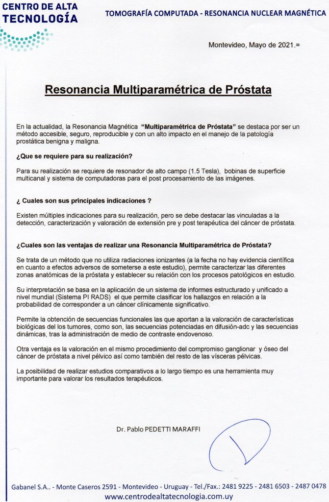 En la actualidad, la Resonancia Magnética “Multiparamétrica de Próstata” se destaca por ser un método accesible, seguro, reproducible y con un alto impacto en el manejo de la patología prostática benigna y maligna.